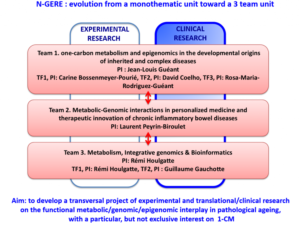 The scientific project of the unit takes into account our recent evolution. It is based on the most relevant scientific results, the introduction of new models and tools of experimental research and clinical research. It also takes into account the strong involvement of the unit in the local, national and international environment, based on the leading role that the unit has played in shaping the FHU ARRIMAGE, the AGIR international call of University of Lorraine on diseased ageing and its involvement in the coordination of a work package of the impact program entitled GEENAGE of Lorraine University of Excellence. Internationally, the unit has taken the initiative to build national and European projects, which, although preselected and well assessed, have not been funded. The main changes that have influenced the frame of the new project are the venue of full Inserm investigators and the capacity of the young academic staff to conduct research programs. We have developed a strong incentive strategy to prepare the HDR for several lecturers and we have benefited from the promotion to PU-PH of several colleagues. Rémi Houlgatte, Inserm research director joined the unit and set up within a research group in Integrative Genomics and Metabolism. David Coelho has been recruited as Inserm senior researcher (CR1) 2 years ago, to develop a project on the pathomechanisms of inherited disorders of the one-carbon metabolism (1-CM). Meanwhile, Laurent Peyrin-Biroulet strongly developed clinical high-level research in the field of inflammatory bowel diseases, while continuing to develop experimental research. These developments contributed to meet the academic capacity to propose a project structured and supported by three teams. This structure in multi-unit teams had not been possible during the previous contract, given the reti