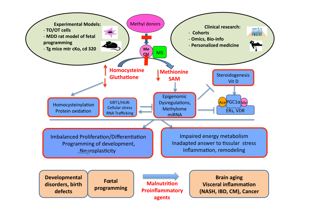 Team 1 “One-carbon metabolism and epigenomics in developmental origins of inherited and complex diseases” led by Jean-Louis Guéant. The team will dissect genome/epigenome/phenotype relationships by up-to-date “omic” technologies and will investigate pathogenesis of inherited disorders of Cbl metabolism and complex diseases related to foetal programming, using mice, rats and fibroblasts and cohort studies. The team project will be developed in 3 tasks, « one-carbon metabolism and neurodevelopment », led by Carine Pourié, « pathomechanisms of inherited diseases of the one-carbon metabolism », led by David Coelho and « developmental origins of complex diseases », led by Rosa-Maria Guéant-Rodriguez.