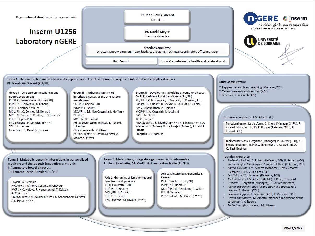The unit was a mono-thematic unit organised in 4 axes between 2012 and 2017. It will move to an organisation in 3 teams with 3 team leaders and task PIs. We have improved our management of Hygiene and Security and Technical work environment with the creation of a ‘commission locale d’hygiène, sécurité et conditions de travail’ (CLHSCT). This new organization leads us to adapt the coordination and management of the unit, as follows: