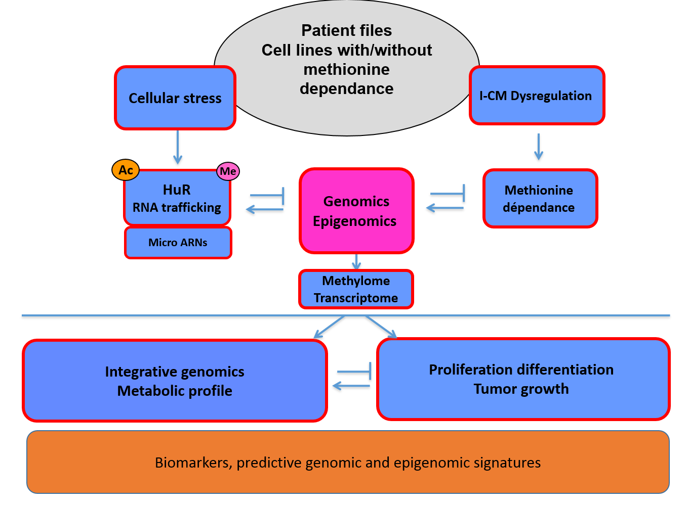Metabolism, Genomics & Cancer. We will study the links between one carbon metabolism and epigenomics modifications of oncogenesis, with two aims. According to promising results, the cellular level of SAM is directly under the influence of one carbon metabolism B12 vitamin and could trigger methionine dependence mechanisms, the cytoplasm targeting of RNA binding proteins and their interactions with non-coding RNAs and the loss of pro-oncogenes promoter methylation, including in meningioma, gastric cancer and leukemia. The first aim will be to identify the interactions between one carbon metabolism and oncogenesis through methylome alterations, post-translational modifications of RBP (with a special interest for HuR) and their consequences on mRNA and non-coding RNAs in cerebral tumors, lung carcinomas and lymphoma/leukemia. The second aim will be to identify the mechanisms and consequences of methionine dependency in cancer stem cells (CSC). We will dissect the metabolic pathways responsible for methionine dependency and we will determine whether methionine restriction eradicates CSC, and prevents tumor growth. We will dissect the underlying transcriptomic and proteomic profiles in human cell lines with « tumor spheres » and different aggressiveness.