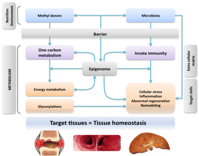 We will address an interdependent network of mechanisms in the three disease groups from environment to cellular consequences. The first level of the network is the environment and multi-organ system, for which we will focus our interest on dietary methyl donors and dysbiosis as master components of environmental factors acting on metabolism epigenomic, energy metabolism and cellular stress. Barriers (intestinal and gastric epithelium, stellate cells, synoviocytes) will be considered as a function of their pathological duality, protection of organs and tissues from environment and targets of cellular and tissue stress. Epigenomic plays a central role through its influence on energy metabolism, reticulum stress and innate immunity. Remodeling will be regarded as a result of cellular stress, inflammation and extra-cellular matrix.